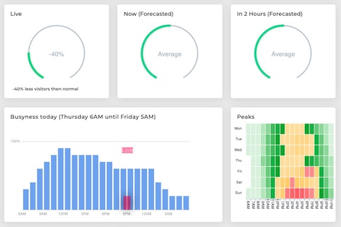 Analyse foot-traffic of individual venues. Show a visitor forecast for the coming hours and live analysis. Detects the peak hours, when it will be quiet, when most visitors are coming and leaving, and reports a week overview.