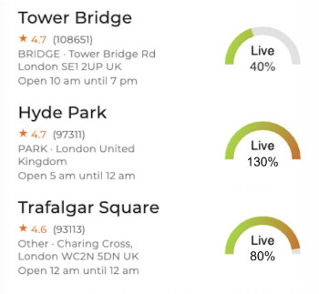 For popular locations, BestTime provides live foot traffic data. In real-time, see how busy a venue is compared to the same day and hour in previous weeks.