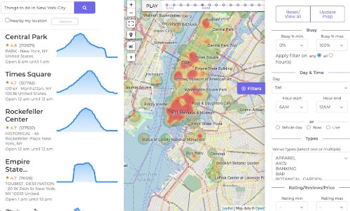 BestTime has created a tool that lets you search and filter world-wide foot-traffic data in order to find the best venues for whatever your needs may be. Whether it's finding where to go out Friday night or visiting a grocery store when it's less busy, this is the tool for you! Type for example "Busy bars in San Fransisco Friday evening", "Quiet supermarkets Sydney Australia on Sunday from 8 AM until 11 AM", or "Things to do in New York City Wednesday afternoon". The data is also available through the BestTime.app software API.